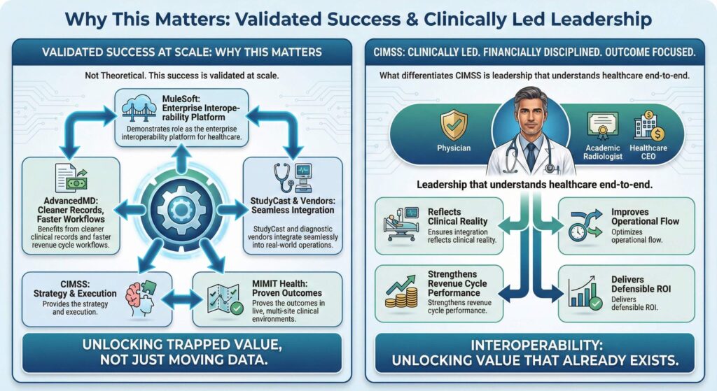 At CIMSS Innovative Solutions, we architect interoperability platforms. At MIMIT Health, we operate them every single day across multiple clinical sites throughout Illinois. Together, CIMSS and MIMIT Health form something pretty rare: an ecosystem where interoperability isn’t theoretical. It’s live. Production-grade. Financially measurable and clinically impactful, delivering real improvements in operational efficiency, revenue performance, clinician experience, and patient care.