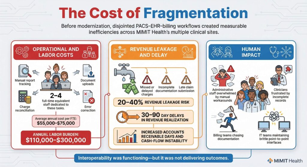 Before we modernized our systems, disjointed PACS–EHR-billing workflows created measurable inefficiencies across MIMIT Health’s multiple clinical sites. Let me break down what that looked like.
