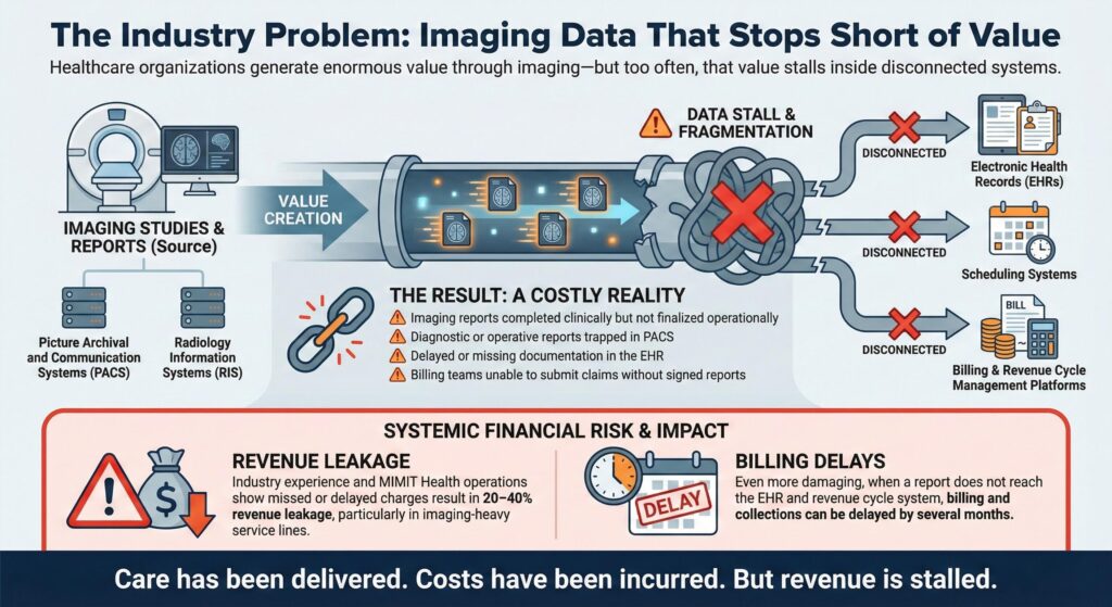 This fragmentation introduces serious financial risk. Industry experience and real-world operations at MIMIT Health show that missed or delayed charges can result in 20–40% revenue leakage, particularly in imaging-heavy service lines. Even worse? When a completed diagnostic or operative report doesn’t reach the EHR and the revenue cycle system, billing and collections can be delayed by several months.