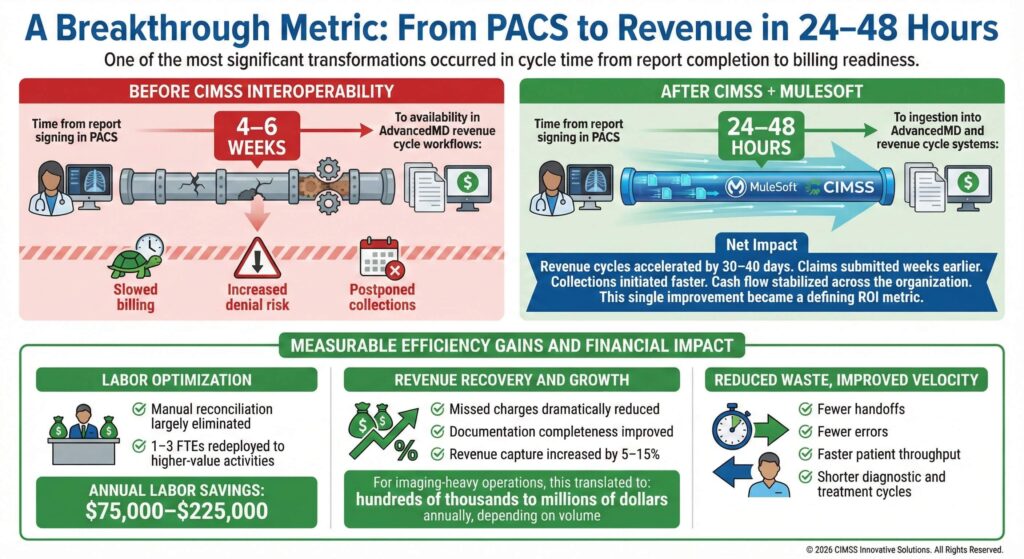 Time from report signing in PACS to availability in AdvancedMD revenue cycle workflows: 4–6 weeks. This delay slowed billing, increased denial risk, and postponed collections. You can imagine what that does to cash flow.